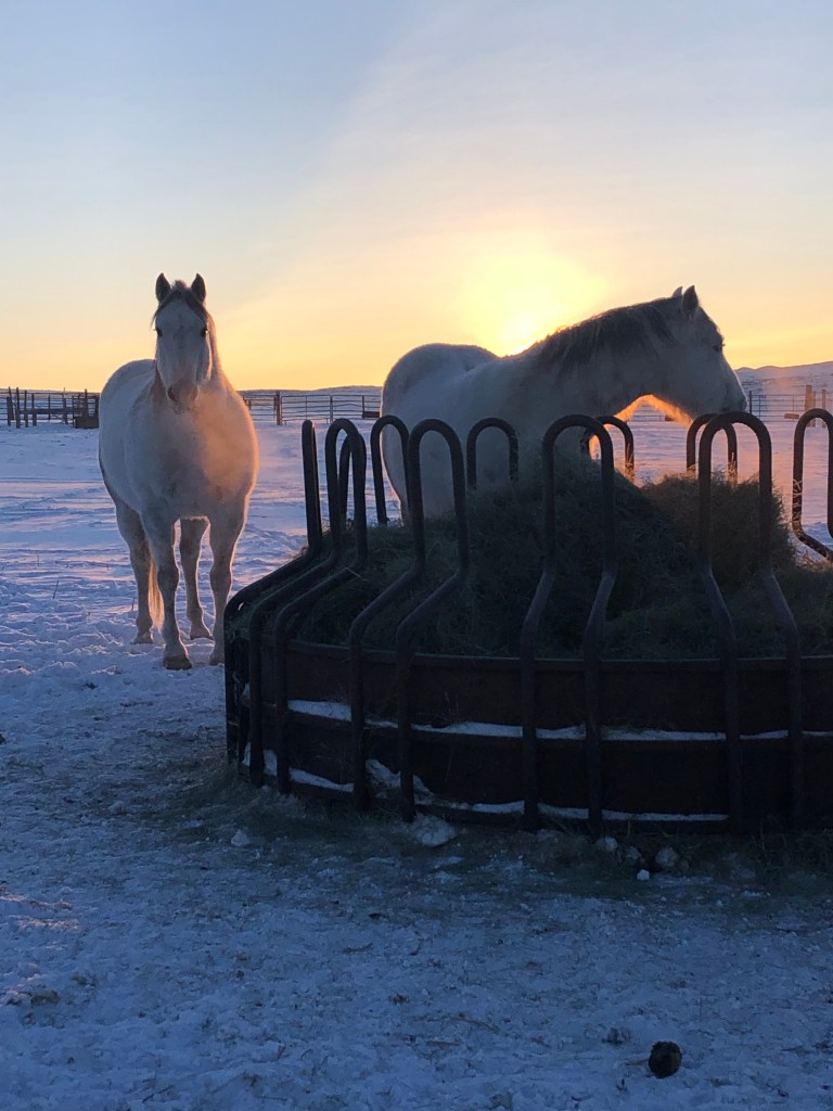 To simplify some of our chores, we kept some of the horses in, and took hay out to the others. Gumbo and Gringo greeted me at sunrise when it was -40.