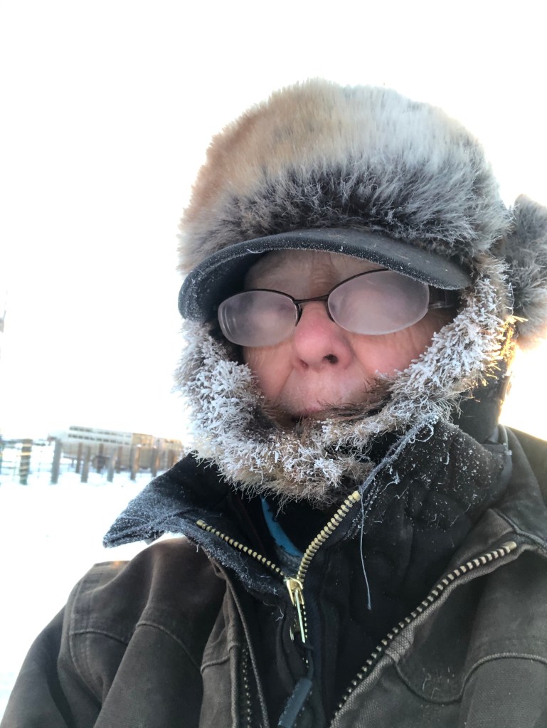 The Head Honcho (at 86) and I feed all the cows hay and chop ice for most of them every morning. He often likes to sleep late, but when it’s cold out he’s up hours before the sun, worried about the cattle and eager to get feed to them.