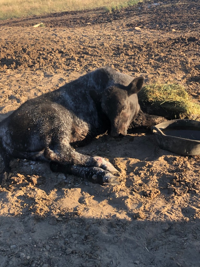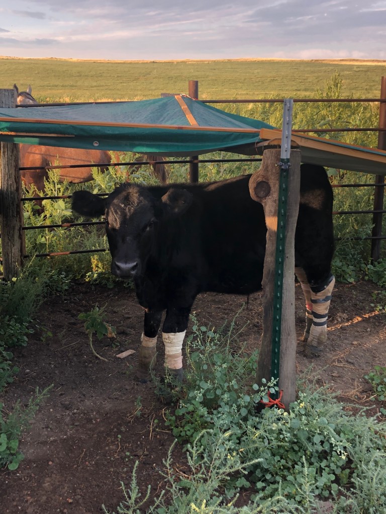 Born in March, the calf weighed about 250 pounds and was one of the bigger steer calves at the time. He hadn’t gotten up by the next morning but he’d pulled himself around a bit, so we put portable corral panels around him to protect his feed and water from other cattle and tied tarps around and over the panels for shade. He ate and drank, and after 5 days he did, finally, get up. His mother may have come around when we weren’t there at first, but we never saw a cow that acted like his mother. He was old enough by then that he didn’t have to have milk and he eagerly ate his hay and grain.