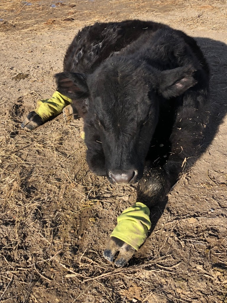 The hide on his legs felt hard from the moment we rescued him, and started flaking off the back of his front knees within a few days. We talked to Dr. Abbie Schoonover of the Broadus Vet Clinic when we realized how hard his leg hide was, and have followed her advice throughout. She explained that essentially, his hide was “burned” from being in water for so long. (Abbie is a friend as well as our vet, so I informally use her first name, fully respecting her title as Dr.) As Abbie suggested, I oiled his legs where the hide flaked off, which was only on the backs of his front legs above the knee, then bandaged the larger areas as needed. Nearly all the hide on his back legs and the lower front legs came off in large chunks. The hide on the left front leg remained an intact tube that I finally cut apart to remove. When the hide was in the shedding process, we used it as a self bandage when appropriate.